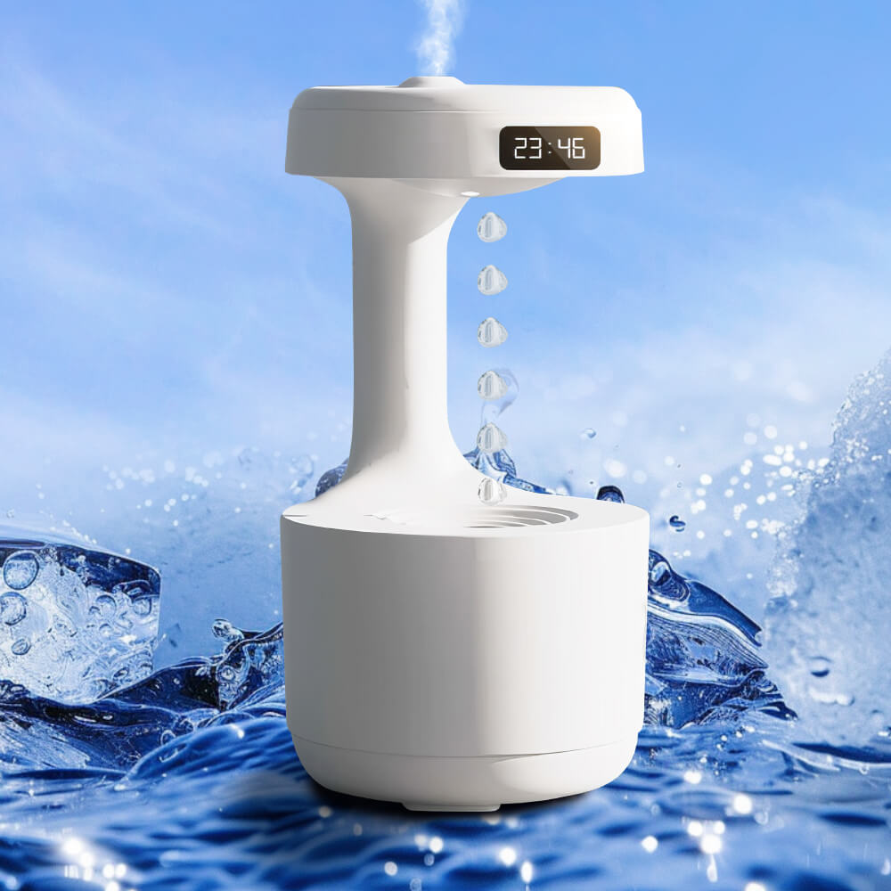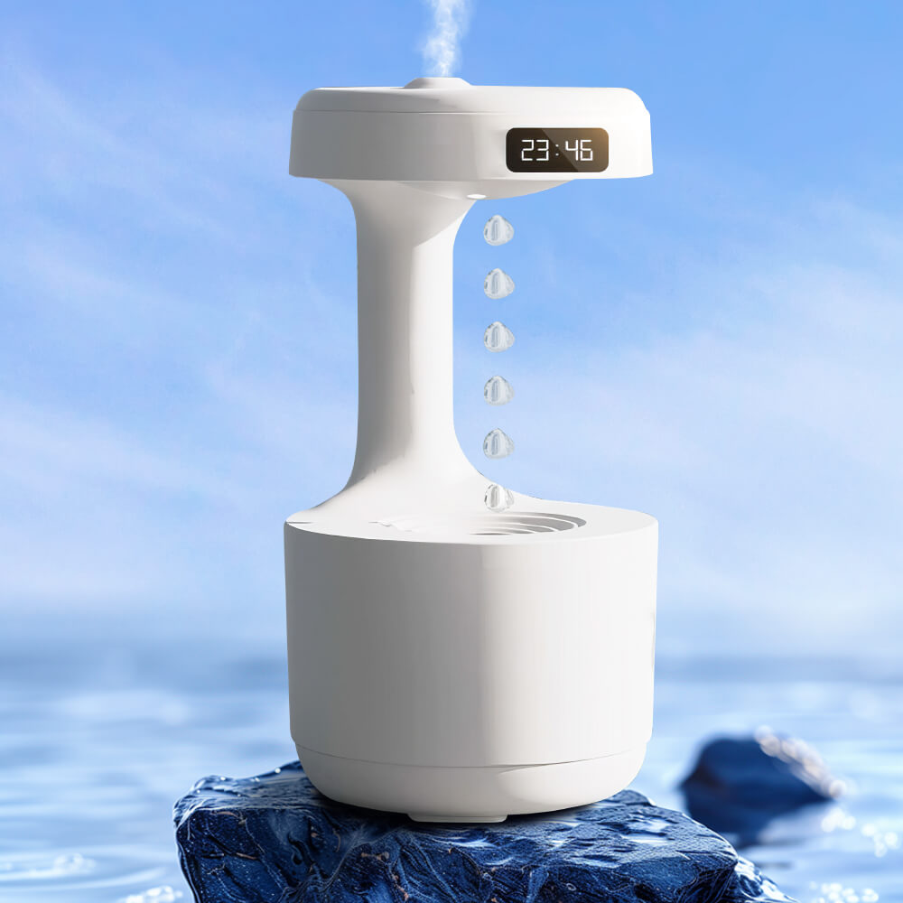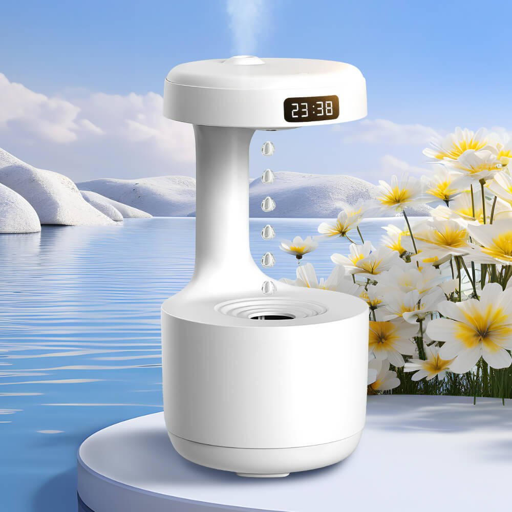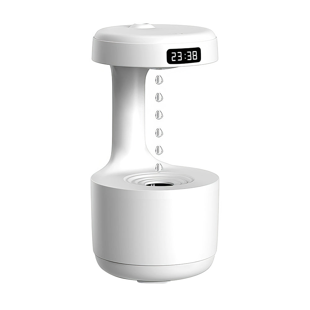 Unique design meets everyday comfort. This ultrasonic humidifier combines an anti-gravity water-drop effect with cool mist, a digital clock display, and quiet operation—bringing both functionality and decoration to your home or office.
